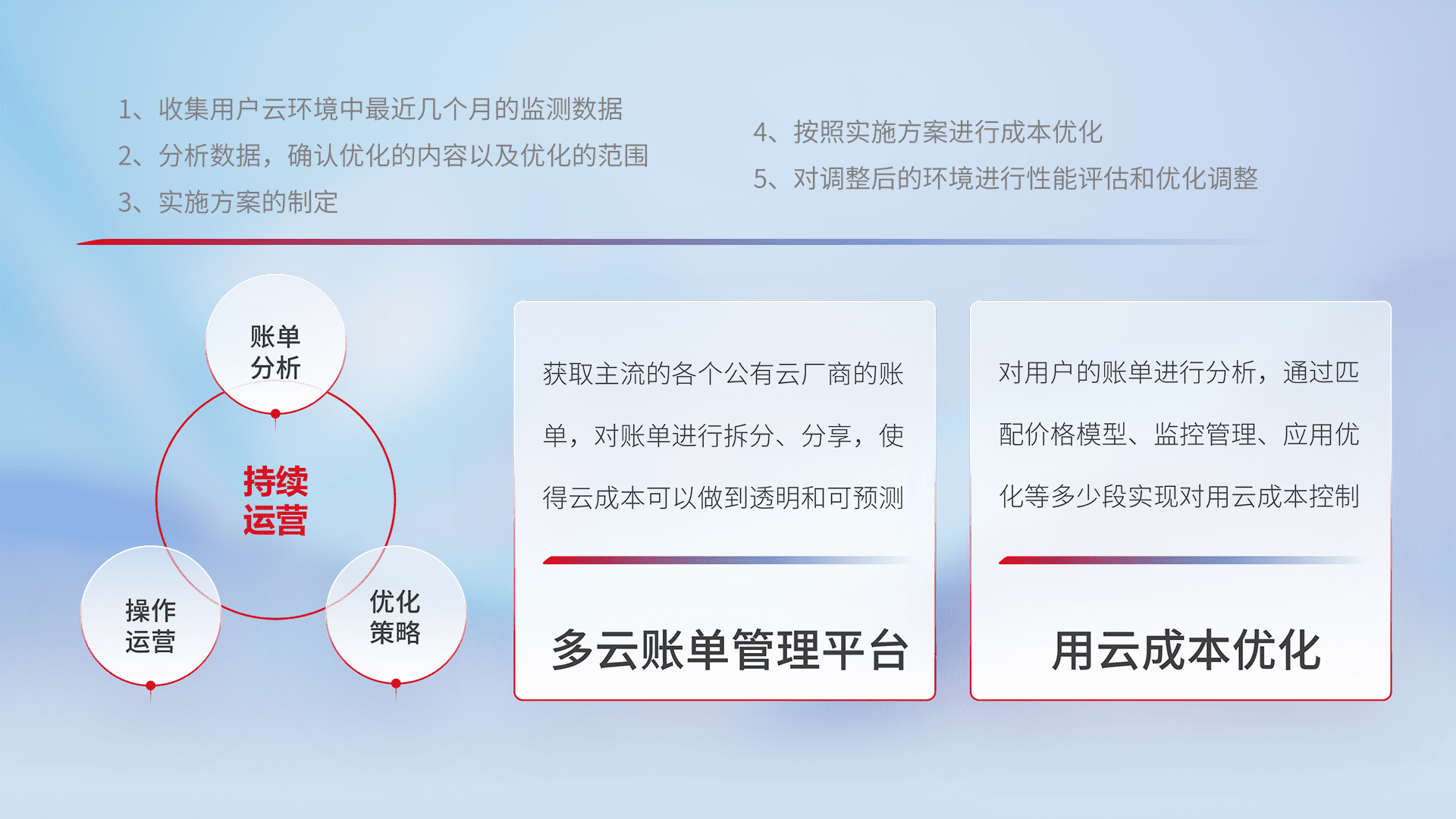 通过多云纳管,,以统一的资源数据模型把客户的云资源进行抽象和封装,,,,进而实现对多云资源的统一操作,,,保障云资源管理的可靠性、、、、稳定性与可用性。。。。量身定制化运维内容,,,,配置、、、、开发运维、、、补丁管理、、备份、、、监控、、、认证和访问管理、、、、审计和日常巡检等,,,,保障在用云过程中的可靠度,,稳定度以及高可用率。。。。